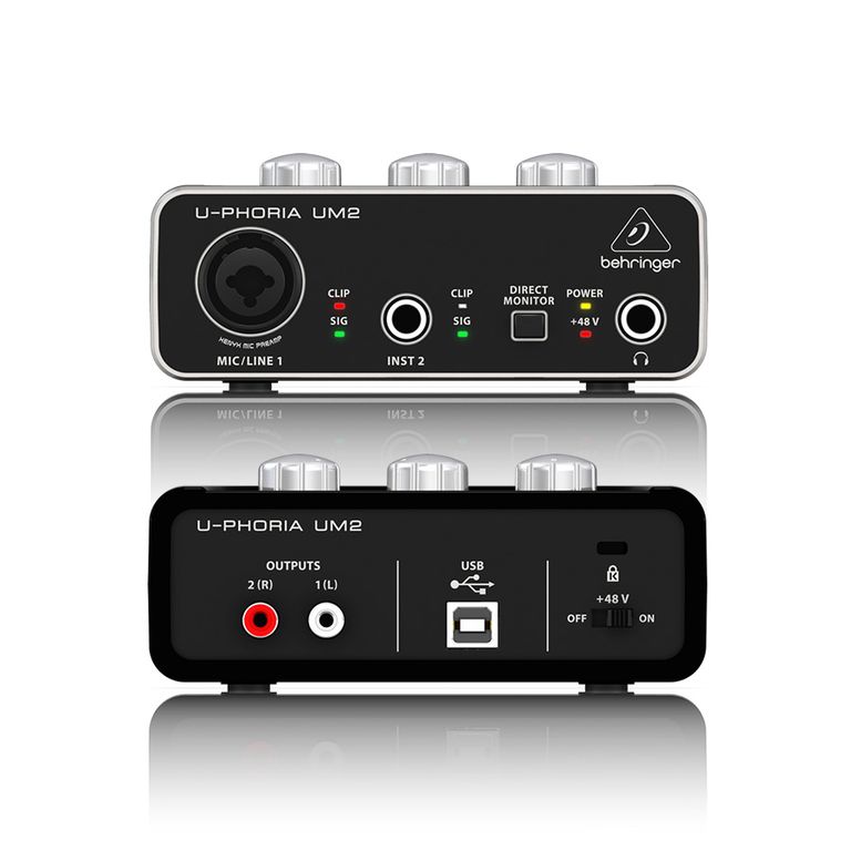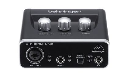 Behringer UM2 внешний звуковой интерфейс, USB2.0, 2 вх/2 вых канала, 1 мик/лин вх (комб. XLR+1/4"TRS, предусилители XENIX), 1 инструментальный вх (1/4" TS), линейный стереовыход (2х RCA), выход на наушники с режимом прямого мониторинга, ПО Tracktion 4 в комплекте