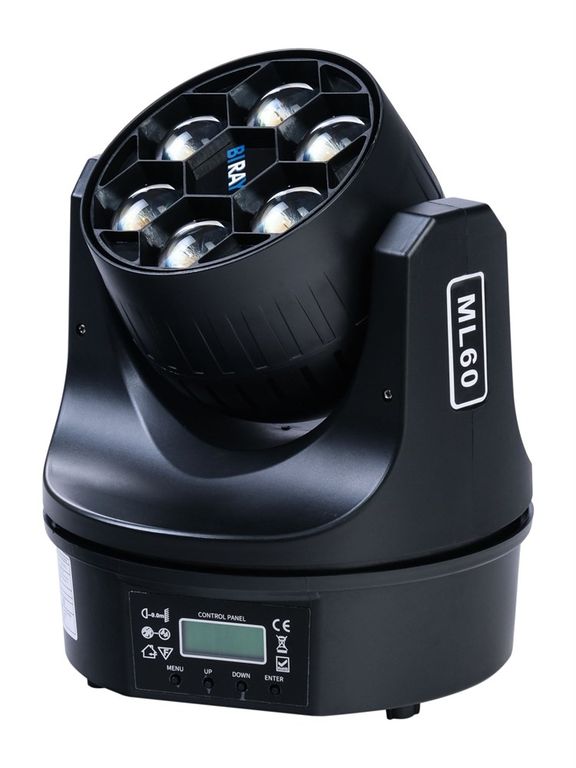 - Bi Ray ML60 – вращающая голова wash и beam, которая широко используется в барах, клубах и самых разных местах развлечений. Прибор оснащен шестью светодиодами RGBW (4 в 1) мощностью по 15 Вт, цвета – красный, зеленый, синий, белый. Доступно четыре режима управления, включая автоматическое, звуком, DMX и мастер/ведомый. Особенности ML60: 6 светодиодов RGBW (4 в 1) по 15 Вт; четыре цвета; четыре режима управления.